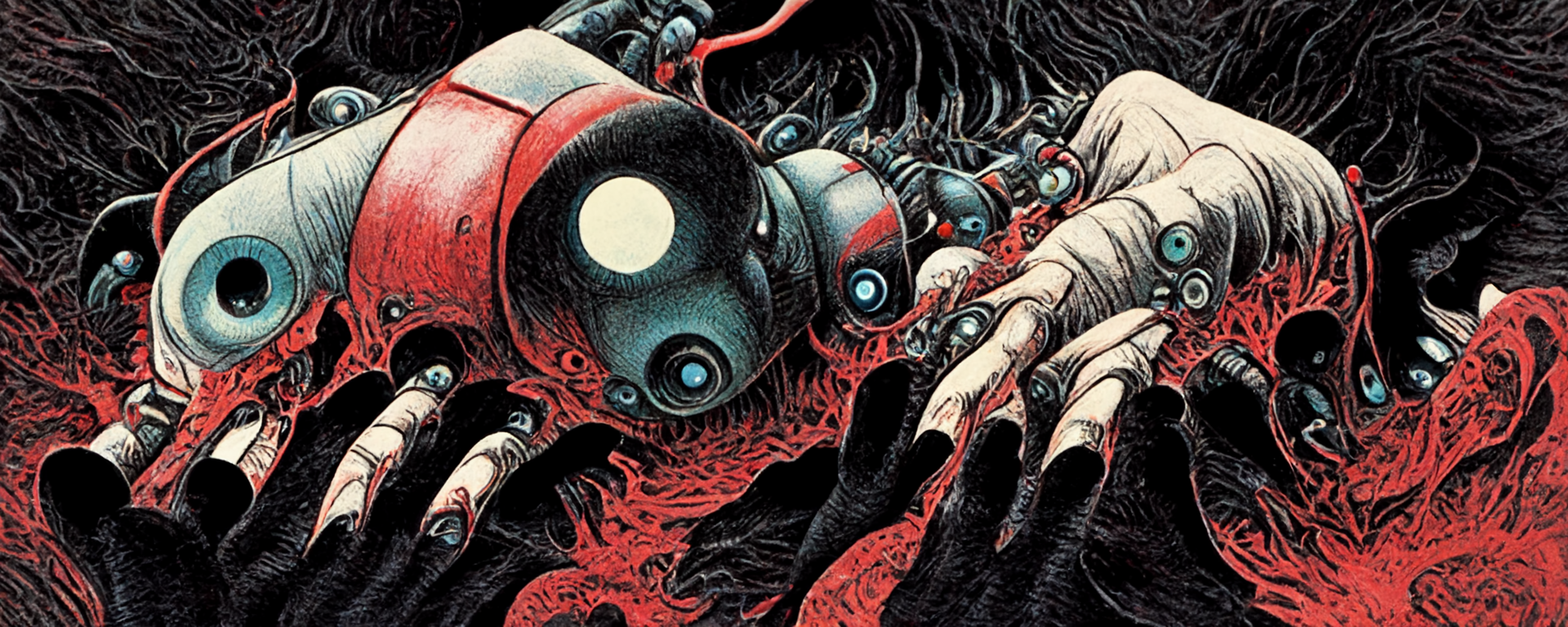 Gradually, my range of view was obscured by a deluge of blood; a macabre curtain drawing close on the ghastly spectacle. The obscured viewport both comforted and heightened my anxious anticipation of the horrors yet to unveil. One of the androids, meanwhile, was engaged in the grotesque task of sifting through their martyred comrade’s carcass, retrieving a small data card amidst splintered metal and synthetic flesh.