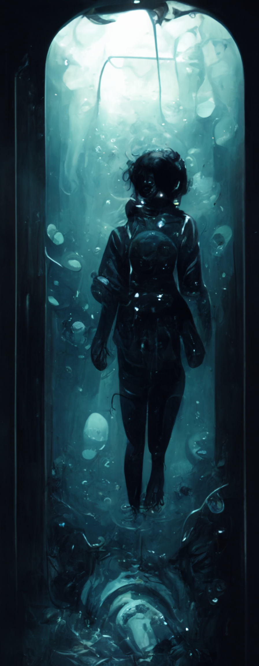 Panic swelled within me once more, compelling me to slam my palms against the confines of my capsule. “Help me, let me out!” I pleaded, encountering only an emotionless veneer in response. Unable to fathom his desensitivity to my plight, I felt violated under his scrutinizing and dehumanizing gaze. His apathy ignited more questions, “Why are you doing this to me? What am I doing here? Who am I?” As my confusion mounted, the capsule’s vents issued a soft hiss before a crystalline gas permeated the fluid environment.