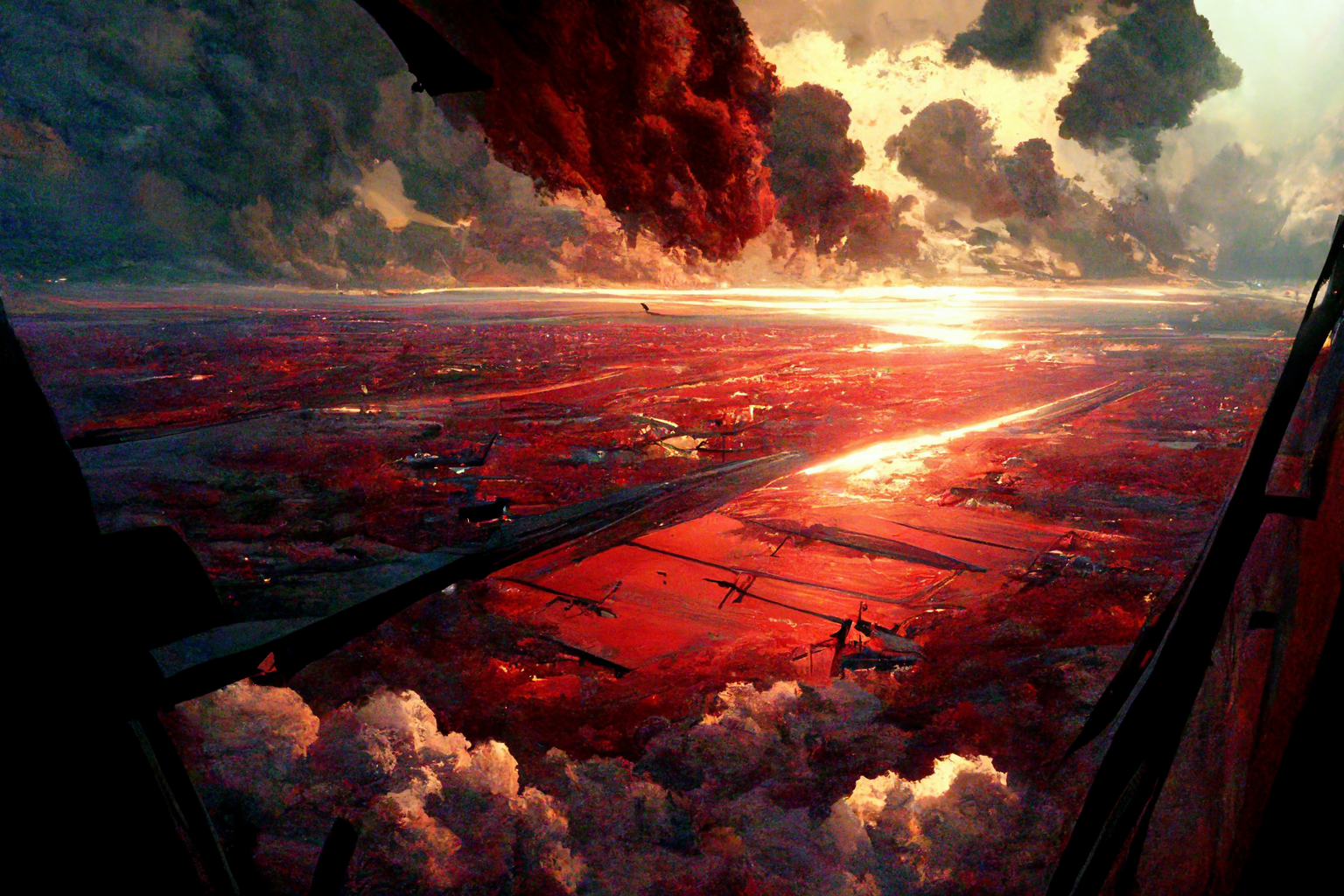 Our elevated platform came to a halt, replaced by the brooding expanse of an iron-rusted sky casting its somber glow over the decaying cityscape. The skeletal remains of towering structures stood draped in the overgrown tendrils of nature’s reclaimed territories. An alien vessel perched on a launching pad, its large wing-like extensions suggesting a flying machine, though I couldn’t be certain.